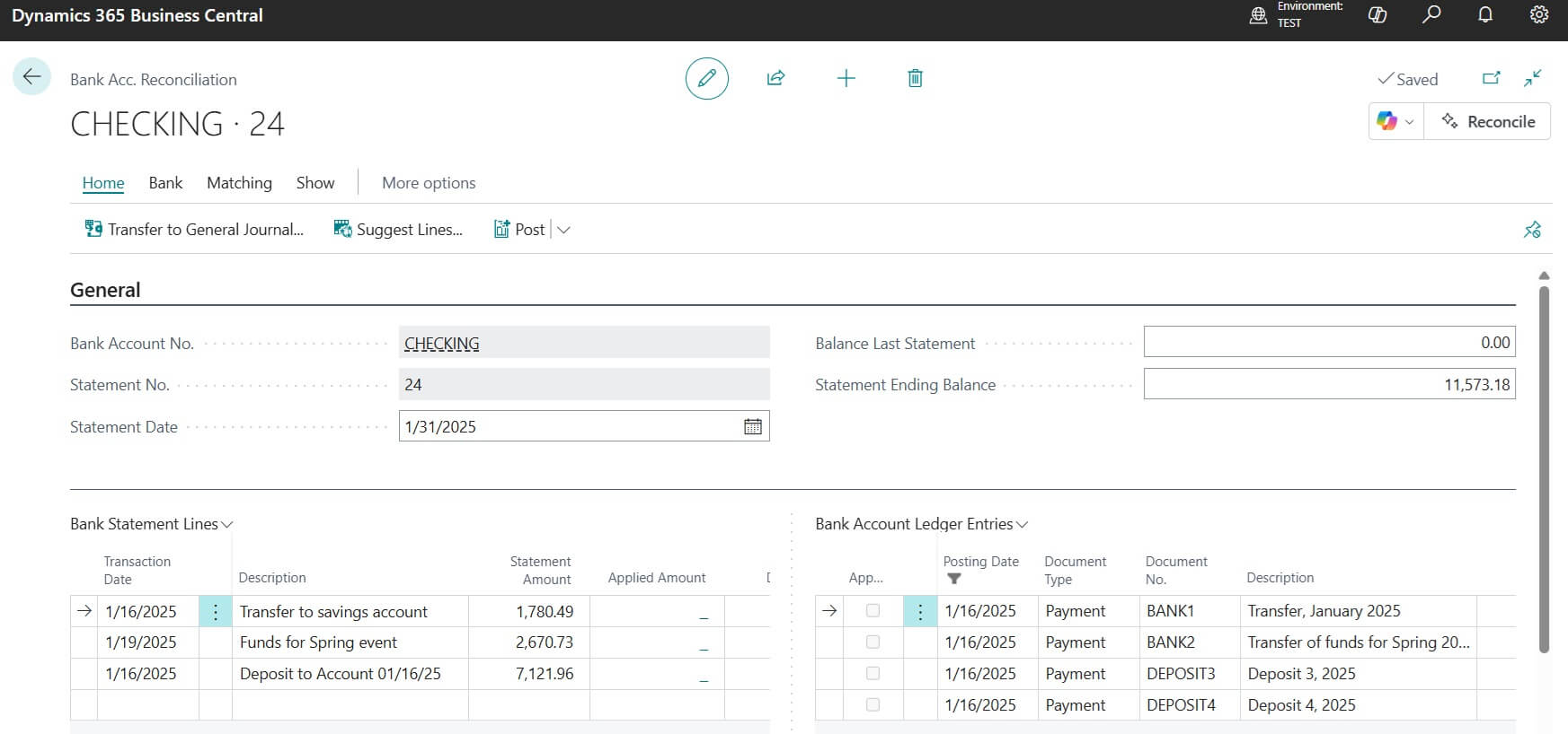 - The lines section is where the actual reconciliation takes place. Here, you match posted transactions from BC with the transactions on the bank statement.