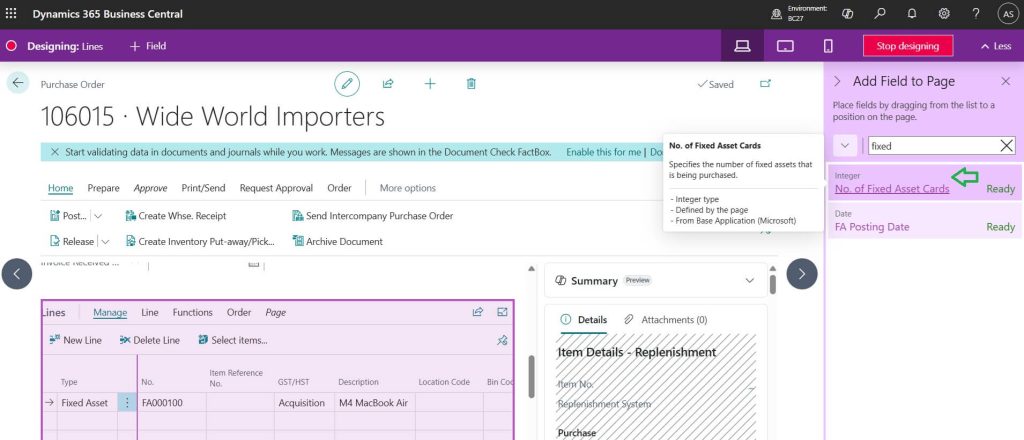 You only need to personalize the purchase order page once by adding the field “Number of Fixed Asset Cards.”