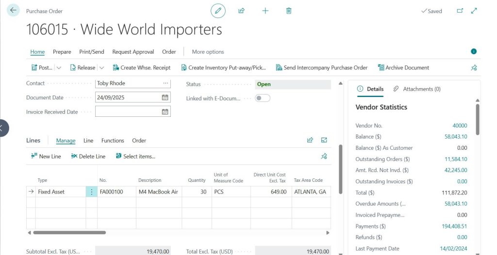 Now select the Vendor and add the fixed asset to a new purchase order and enter the quantity you are buying (e.g., 30 Laptops).