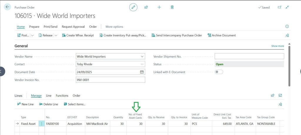 In this example we created the Fixed Asset Card for the FA000100 – M4 Mac Book Air.