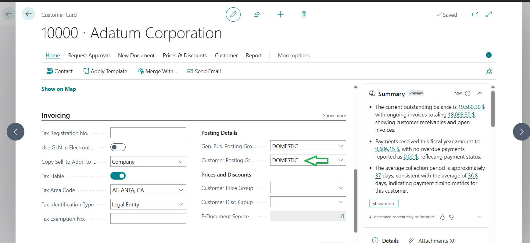 Sample result after assigning the “DOMESTIC” customer posting group is as follows