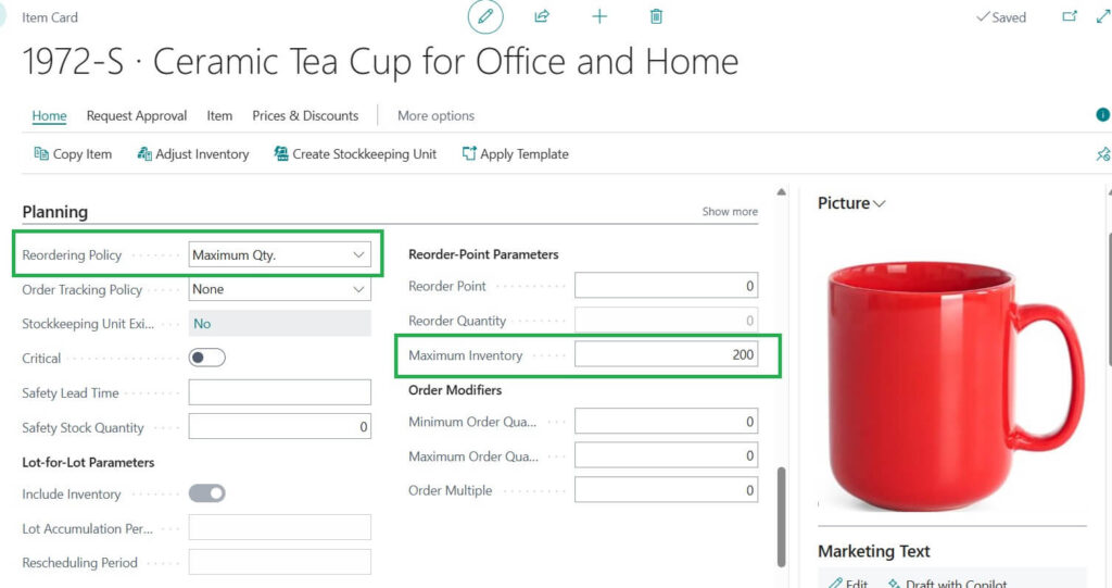 If your maximum stock is 200 mugs and you currently have 75, Business Central suggests ordering 125 to bring it back up to 200.