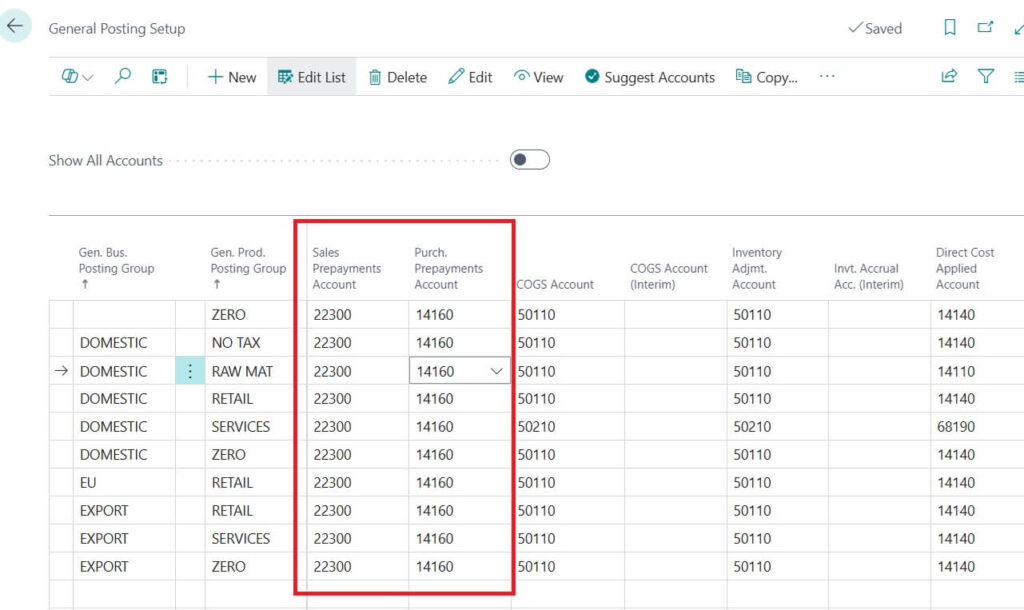 In-order to enable Prepayment Accounts, you needs to assign G/L accounts for Sales Prepayments and Purchase Prepayments. These accounts will temporarily hold the advance payment amounts until final invoicing.