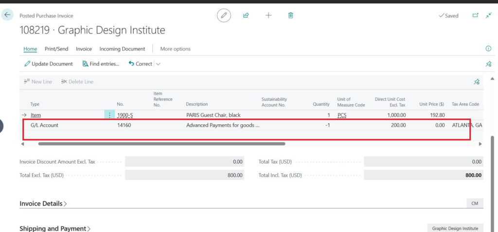 When you post the final invoice, Business Central automatically deducts the prepayment amount, showing you only the balance left to pay.