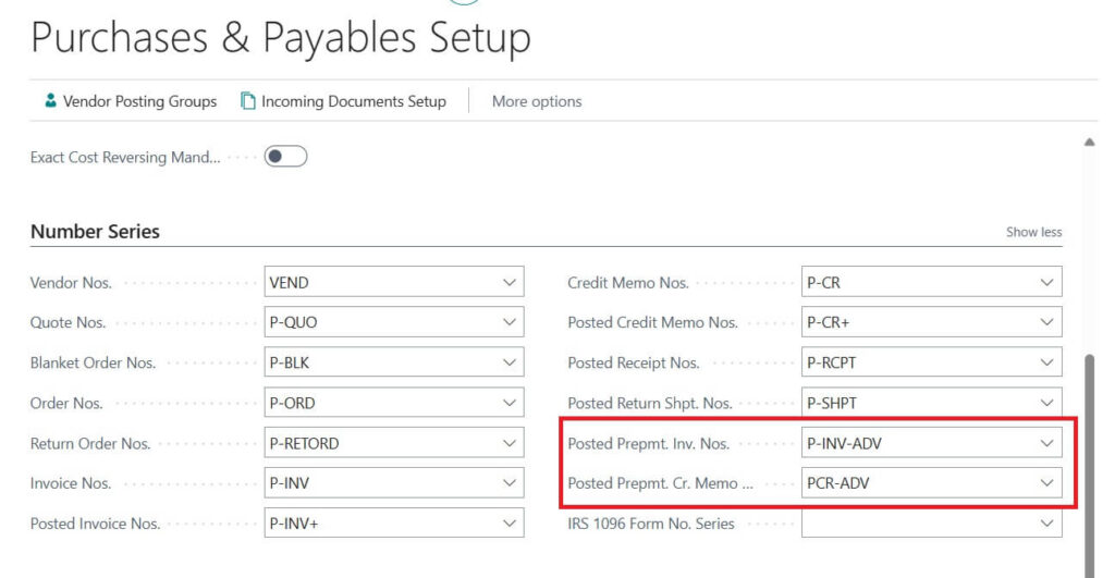 - Posted Prepmt. Inv. Nos. : Specifies the code for the number series that will be used to assign numbers to posted purchase prepayment invoices.
