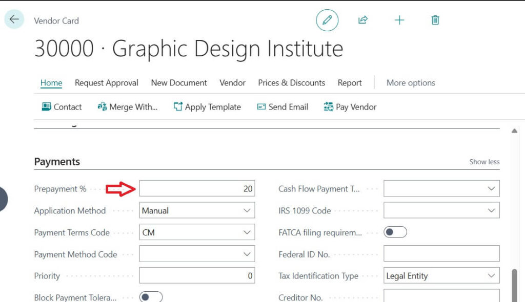 Open the Vendor Card (for supplier prepayments) or Customer Card (for customer prepayments).